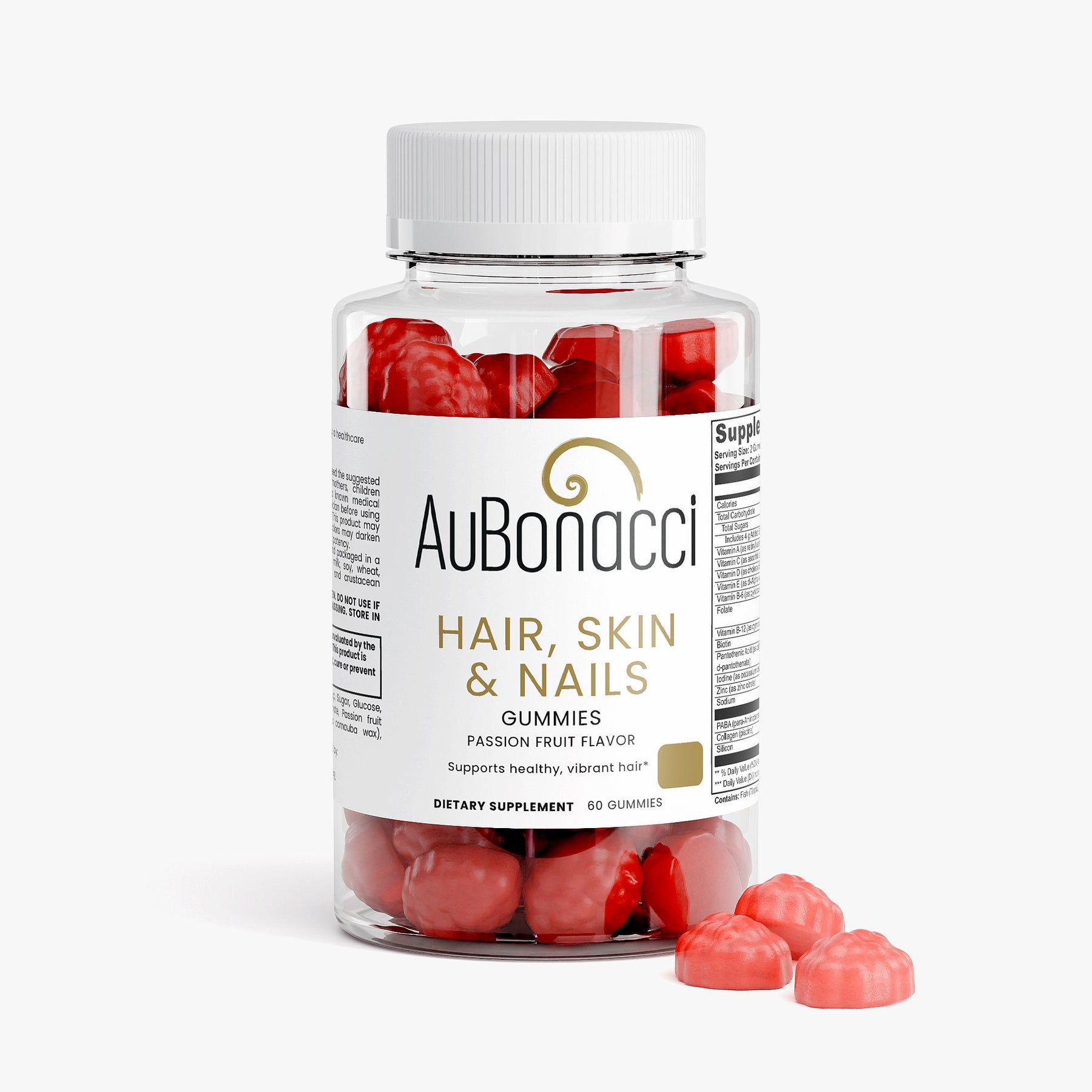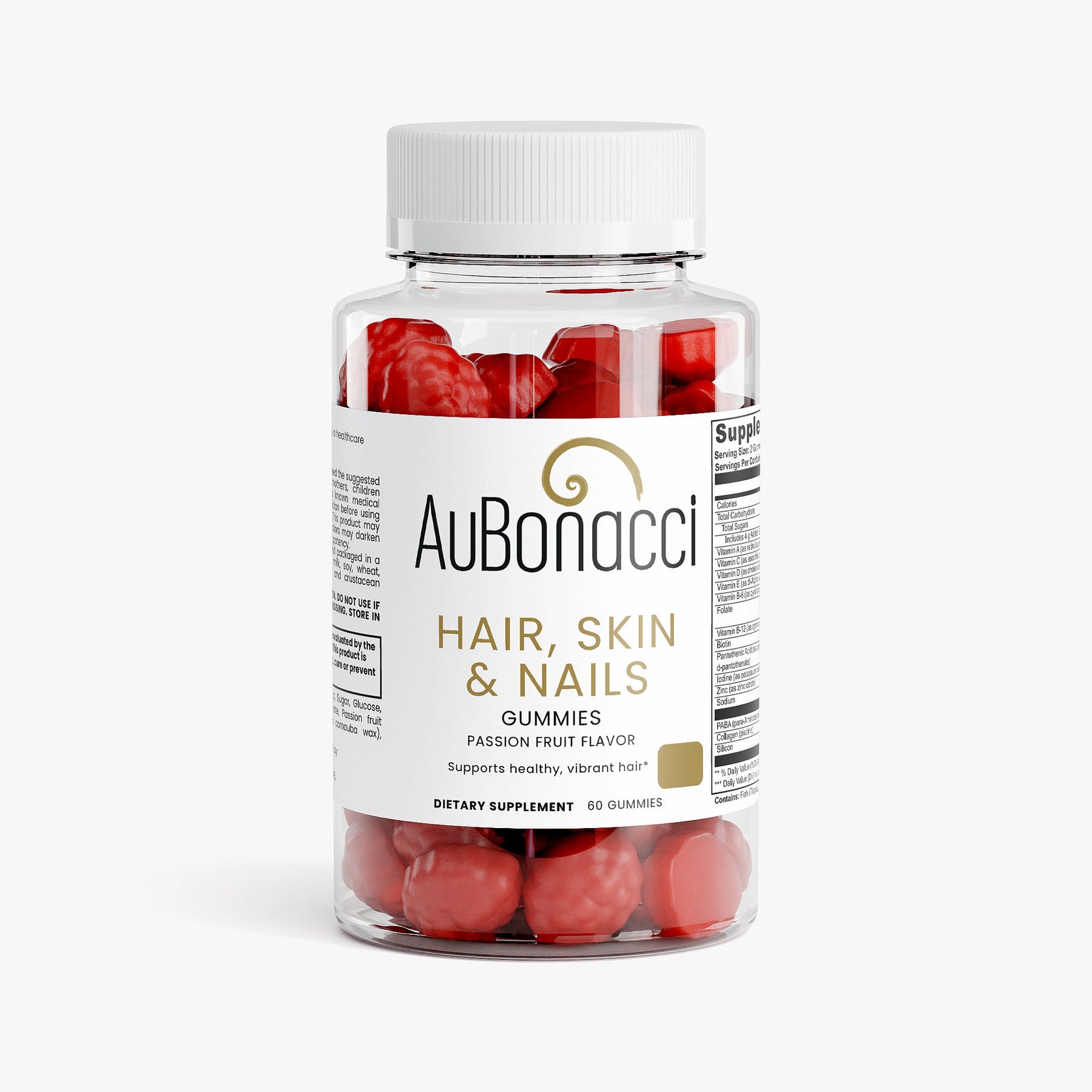 Ingredients: Vitamin A (as retinyl acetate), Vitamin C (as ascorbic acid), Vitamin D (as cholecalciferol), Vitamin E (as dl-Alpha tocopheryl acetate), Vitamin B-6 (as pyridoxine HCI), Folate, Vitamin B-12 (as cyanocobalamin), Biotin, Pantothenic Acid (as calcium d-pantothenate), Iodine (as potassium iodide), Zinc (as zinc citrate), PABA (para-Aminobenzoic Acid), Collagen (piscine), Silicon, Glucose syrup, Sugar, Glucose, Pectin, Citric acid, Sodium citrate, Passion fruit flavor, Vegetable oil (contains carnauba wax), Purple carrot juice concentrate.